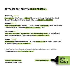 Tabor Film Festival has also an impressive array of musicians who will be performing on six stages, including Neno Belan & Fiumens, Pips Chips & Videoclips, Gabi Novak, Matija Dedić, Zoran Predin, Krankšvester, Kawasaki 3p, Nipplepeople and many others. Visitors will also be able to enjoy workshops, theatre, lectures, book promotions and exhibitions and of course tasty domestic food and beverages.