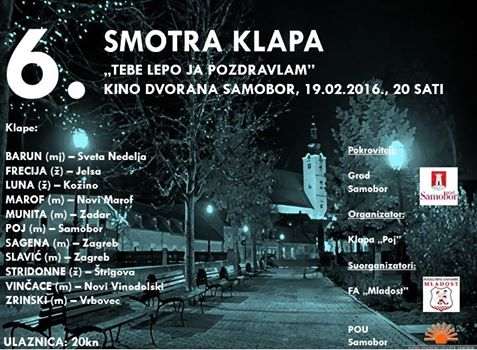 The 6th Festival of Klapa songs called ‘Tebe lepo ja pozdravlam’ will be held in Samobor on Friday, February 19th at 8 pm in POU Samobor Cinema. This year, the festival will present 11 vocal ensembles: Barun from Sveta Nedelja, Frecija from Jelsa on the island of Hvar, Luna from Kožino, Marof (Novi Marof), Munita from Zadar, Poj from Samobor (hosts), Sagena Zagreb, Slavić (Zagreb), Stridonne from Štrigova, Vinčace from Novi Vinodolski, and Zrinski (Vrbovec).
