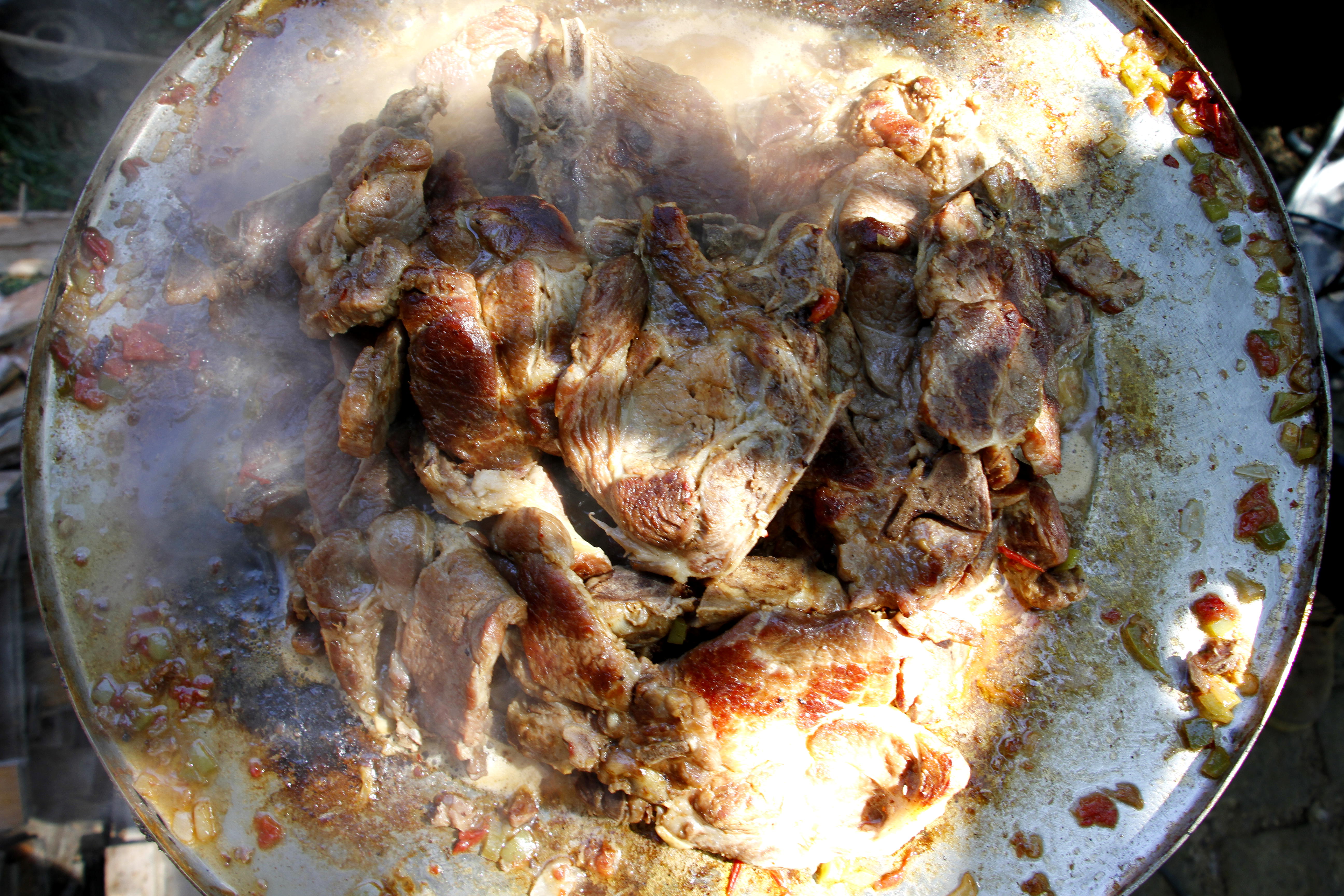 Cutlets are prepared in a stainless steel or aluminium pan placed directly over an open fire. You let the pan heat up before putting frying oil or fat into it. When the fat melts or oil starts to stear, place the meat that you’ve marinated for an hour in it and cook until both sides are golden. Move the meat to the sidelines of the pan and add onions until they simmer, adding carrots, paprikas and finally tomatoes. Next come salt, pepper and other spices, adding water so the mixture does not dry up. Put the meat in the pan and douse with wine to keep the gravy density to your liking. Cook for 30 minutes or so. You can add chilli if you prefer it hot.