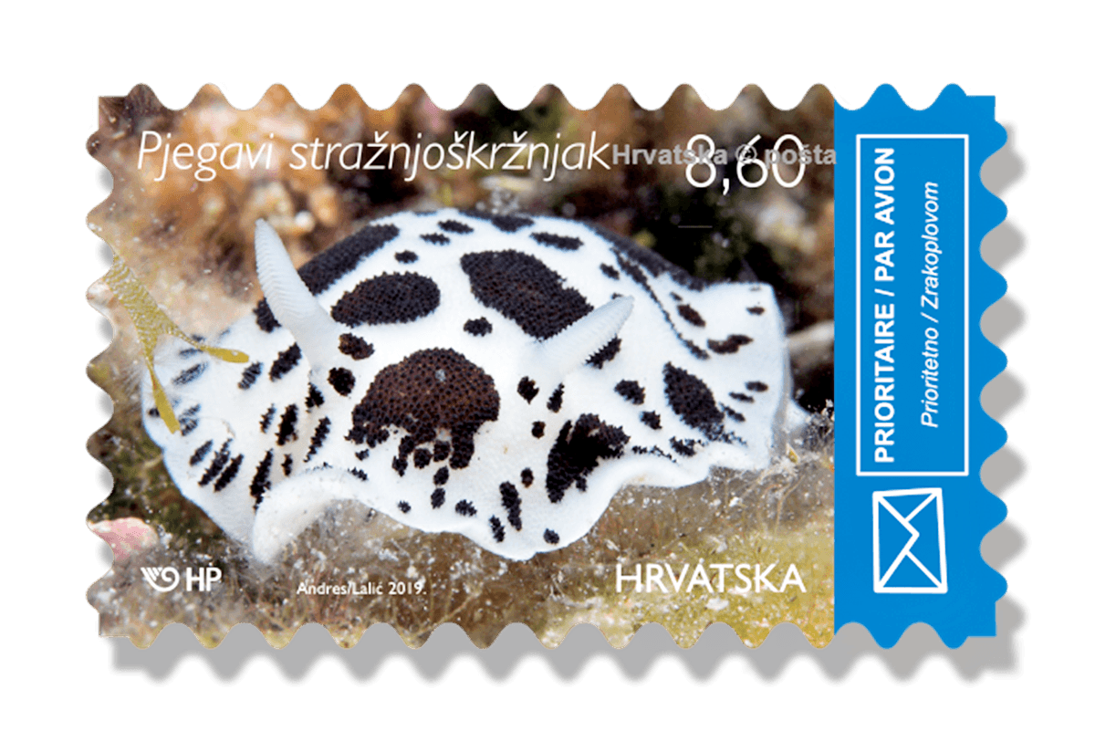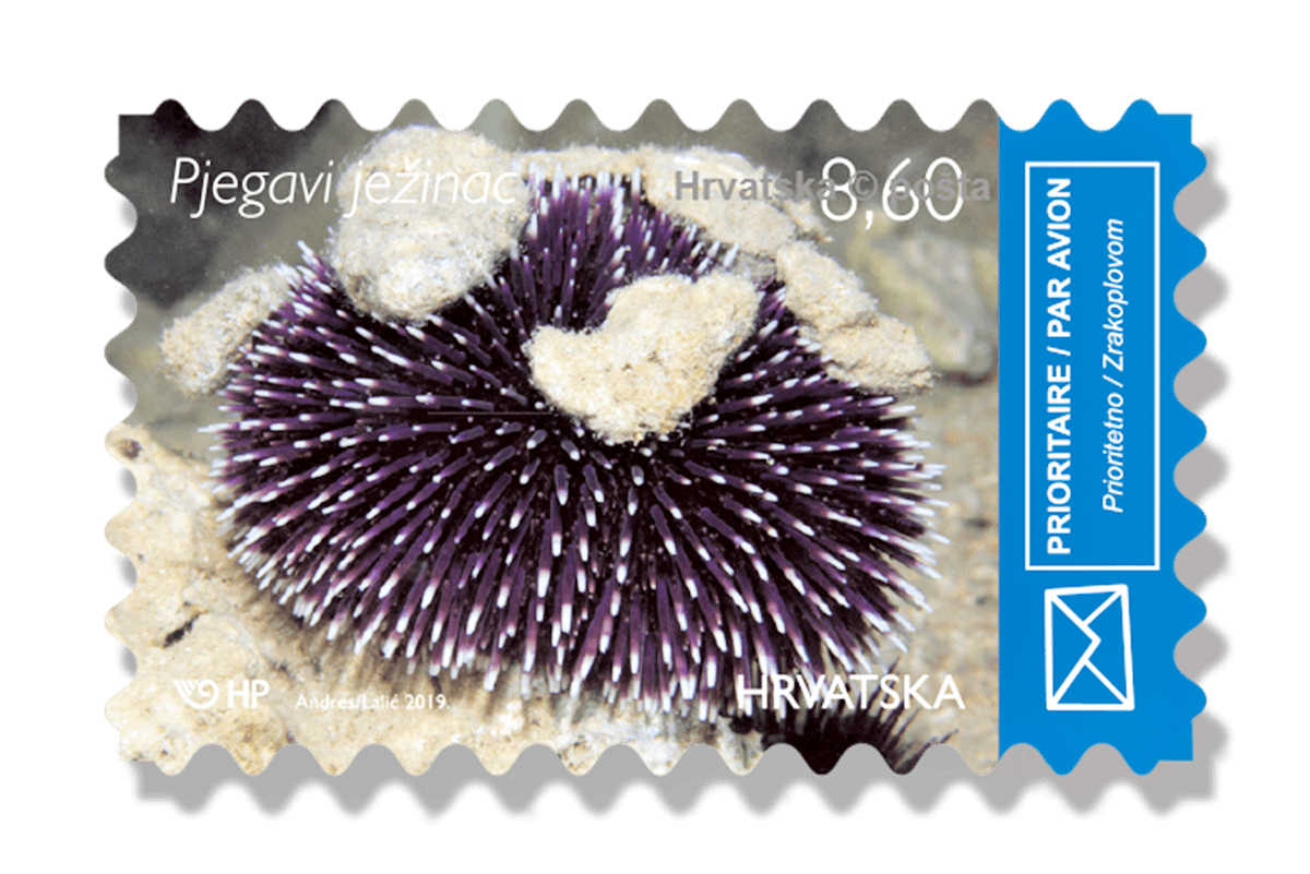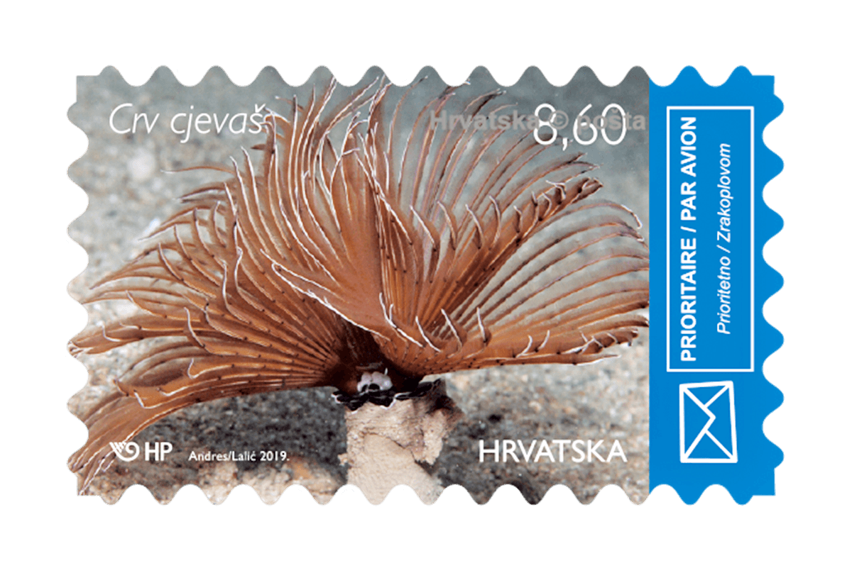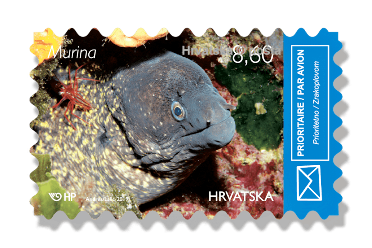 The author of the photographs of sea animals is Dalibor Andres, a photographer from Sisak, and his photos were adapted to print by Alenka Lalić, a designer from Zagreb. Motifs of regular editions include twin fan worm , dotted sea urchin, dotted sea slug or sea cow and Mediterranean moray. The edition consists three million copies, or 750 thousand stamps per motif, and their nominal value is 8,60 kn.