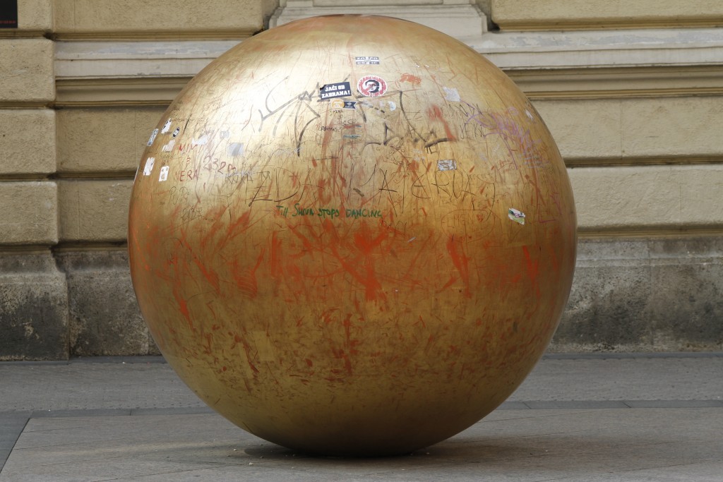 In its time in front of the theater it was repeatedly damaged and painted over, so the City decided to move it to its current location in Bogoviceva street in 1994. By that time the Grounded sun was regarded as one of the symbols of the city (even though it was painted over a couple of times since then, sometimes as pure vandalism, sometimes as an artistic statement), and is probably one of the most interacted statues in the city. Many teens have proclaimed their love on it, punk was not dead on it, mothers off all kinds were mentioned and all sorts of other differing messages written on it. It’s still vandalism, but one that Kozaric unwillingly got used to living with. No matter how many times they repainted it, new generations of teens would not resist writing on it. Now being 92 years old, the artist still takes regular walks on the square, observing children playing around it, tourists taking photos and street artists using it as background to their performance.