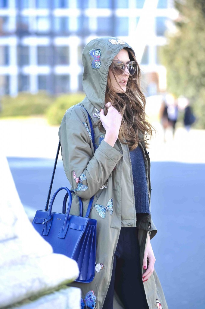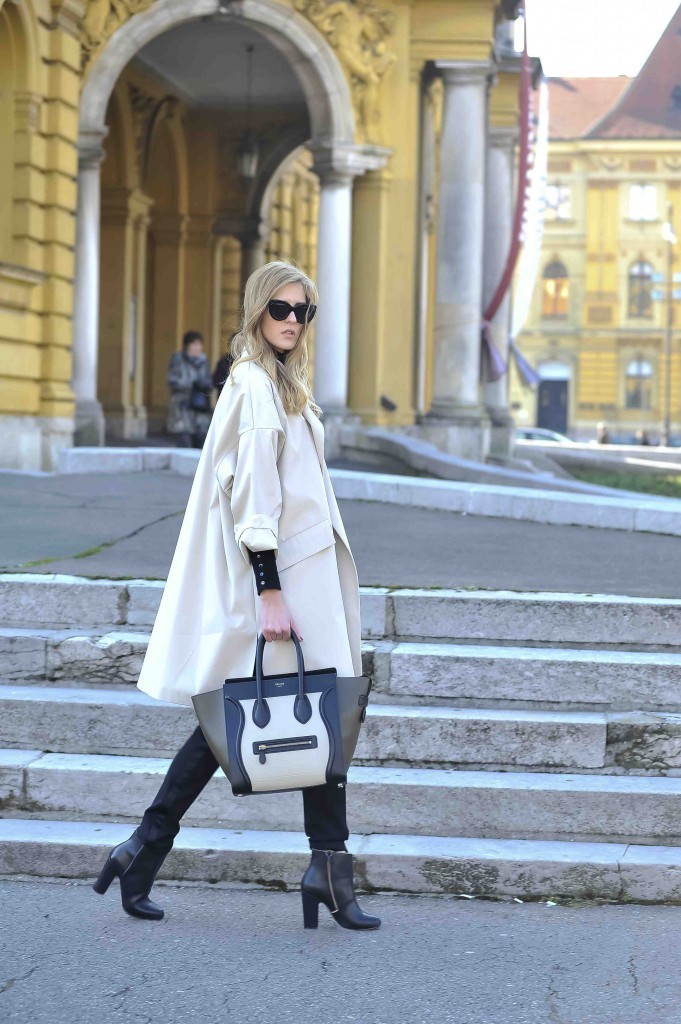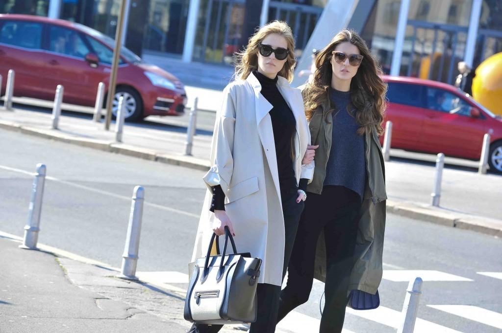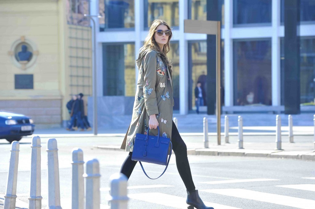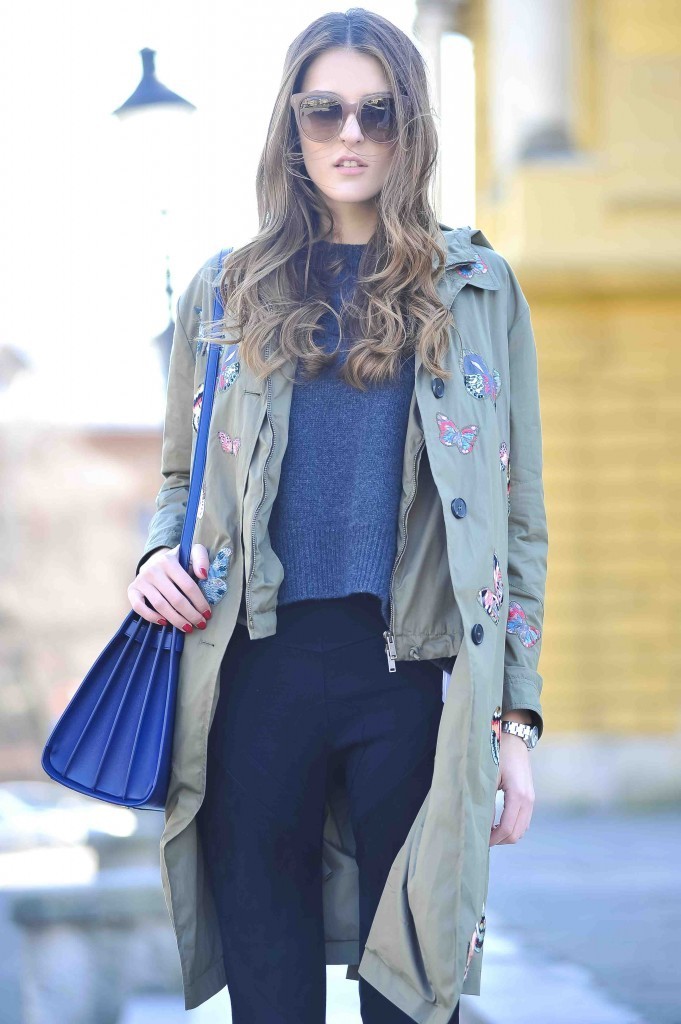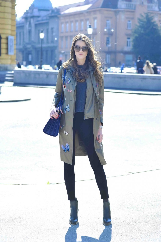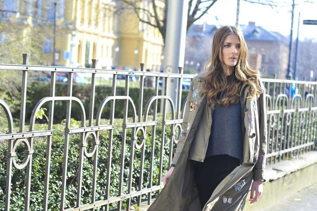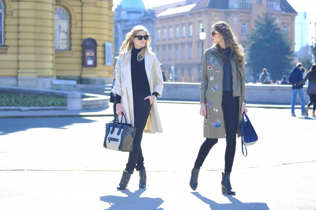 ‘During spring Jen and I spent a lot of time travelling, but we managed to find some time to brilliantly spend one weekend in Zagreb. Of course, besides meeting friends there was a lot to do. All we wanted to do was make some beautiful pictures. On the day, we did them the weather could simply have not been better. I chose to wear something utterly casual yet effortless and chic at the same time. When I stumbled across this amazing oversized trench coat from Maison Margiela in Maria Store, I didn’t even think twice before taking it; I would say it was love at first sight. What I loved most on the coat was its shape and the elaborate details such as the snap buttons. Since I like to wear natural colors I combined the coat with a black turtleneck sweater and a black satin stripe flared leg trousers by Saint Laurent together with heels by…and matched it all together with a tricolor Luggage Tote and a cool pair of sunglasses, both from Celine. Jen decided to wear this beautiful olive-green parka by Valentino with colourful butterfly details (isn’t that embroidery gorgeous?) and paired it with heels by Alexander Wang. To give this look a special note, she took the red sunglasses from Celine and a navy blue Sac De Jour Bag from Saint Laurent.